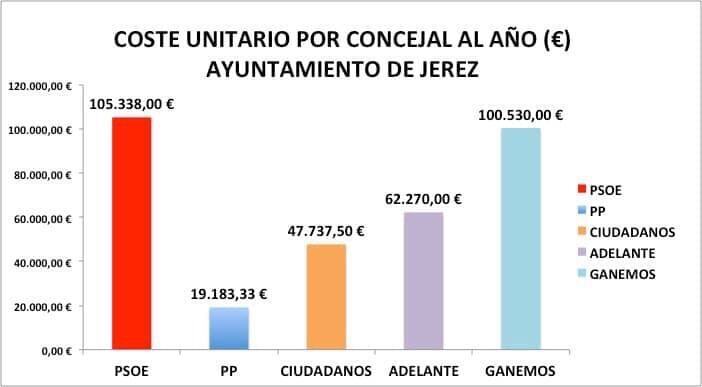Así, mientras el coste de un concejal del PP (de media) es de 19.183 euros, el de Ganemos o uno del PSOE sube hasta 105.388 euros. Un edil de Adelante Jerez 62.720 euros y uno de Ciudadanos 47.737 euros.