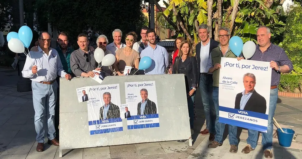 Álvaro de la Calle, candidato a la alcaldía por Jerezanos en Acción, junto a su equipo, ha llevado a cabo la tradicional pegada de carteles en la popular plaza de las Angustias con motivo del inicio de la campaña electoral.