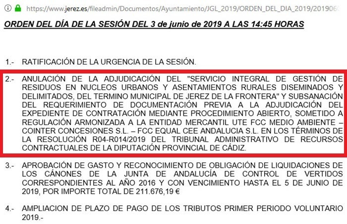 Sin embargo, en propia Junta de Gobierno Local, como se puede ver en el punto número dos de la propia Orden del Día, se desmiente las palabras del edil del PSOE y se admite que El Tribunal de Recursos Contractuales de la Diputación de Cádiz ha dictado una resolución que obliga al Órgano de Contratación, es decir, al Ayuntamiento de Jerez, a anular la adjudicación del contrato de “Servicio Integral de Gestión de Residuos en Núcleos Urbanos y Asentamiento Rurales diseminados y delimitados del término municipal de Jerez” por incumplimiento del artículo 27 del Pliego de Condiciones Administrativas Particulares.