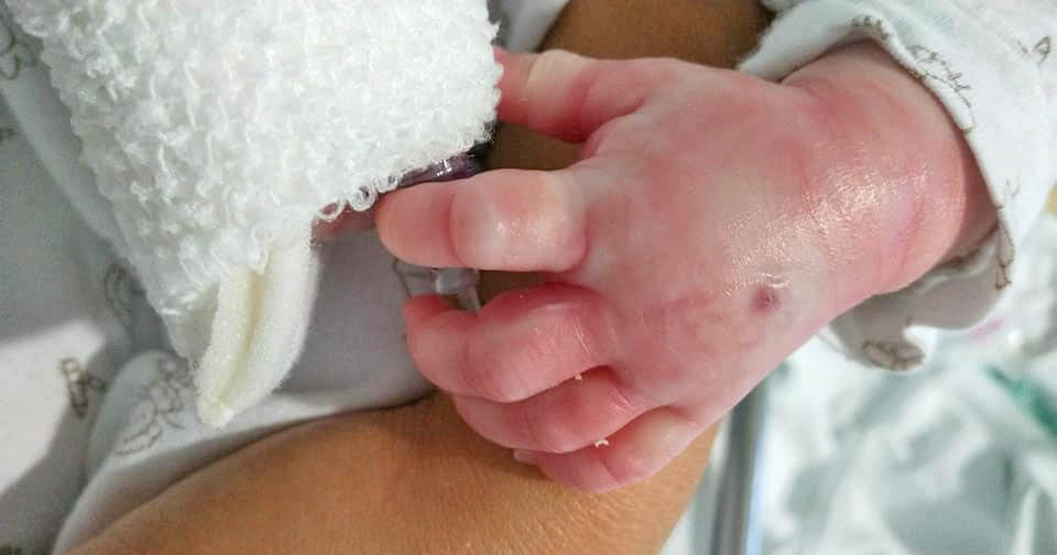 Flebitis en una mano de la bebé sufrida por extravasación de la vía dos días después de someterse a los sueros | Facebook JMR