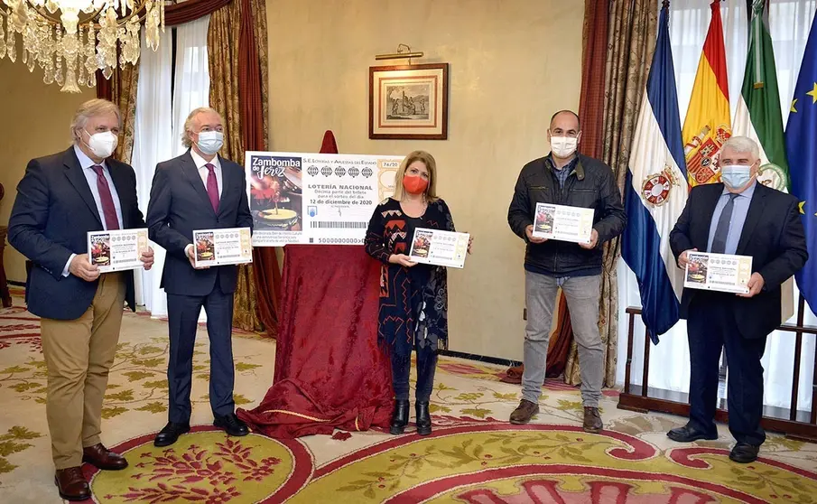 La alcaldesa de Jerez, Mamen Sánchez, y el presidente de la Sociedad Estatal de Loterías y Apuestas del Estado, Jesús Huerta, han presentado la imagen del cupón del sorteo de la ONCE del sábado 12 de diciembre que tienen como protagonista a la Zambomba de Jerez como Bien de Interés Cultural de Andalucía.