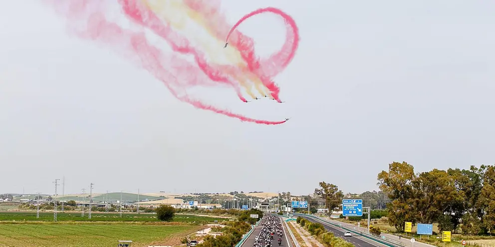 Esta misma tarde, los aviones de la Patrulla Águila acompañarán a la caravana motera que saldrá desde el Circuito de Jerez a las 17 horas, culminando el recorrido en la plaza del Mamelón.