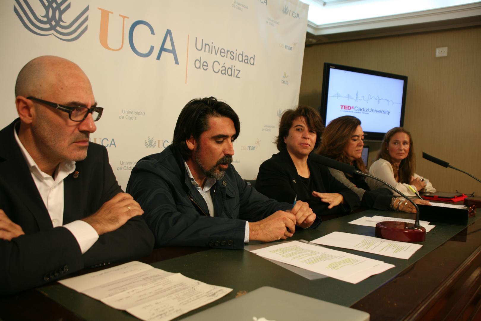 El Comité Organizador de TedxCádizUniversity, compuesto por los vicerrectores de Alumnado y Recursos Docentes y Comunicación de la UCA, Concha Valero y Juan Antonio Poce, respectivamente, el profesor de la UCA, David Selva, junto a Cristina Sierra, Pedro González y Rocío González (TedxBaluarte), ha explicado su programa en el Rectorado.
