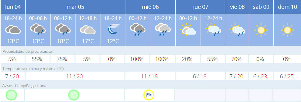 Las precipitaciones en Jerez darán comienzo el martes en su madrugada, con un 75 por ciento de probabilidad, dando un respiro al mediodía para proseguir nuevamente en la madrugada del miércoles con chubascos fuertes y constantes durante todo el día. Además, el mismo miércoles se prevé alerta amarilla por fuertes vientos que podrían superar los 30 kilómetros por hora.