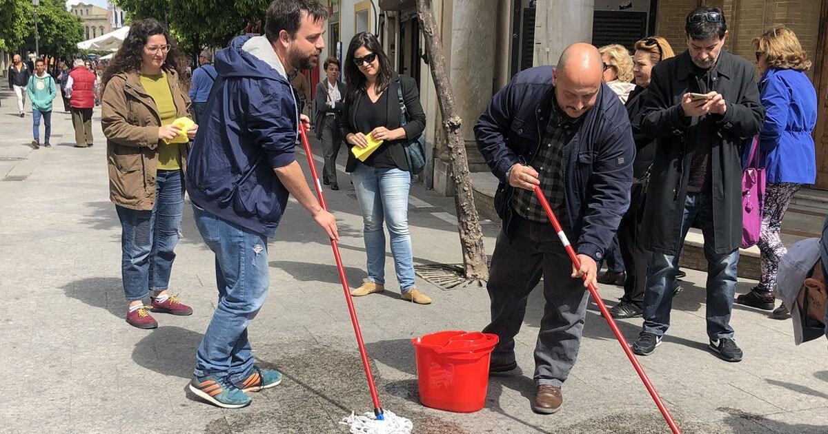Con fregona en mano y con un cubo con agua y lejía, se han presentado los miembros de Adelante Jerez para limpiar las partes de la Calle Larga, para según ellos "desinfectar y limpiar de fascismo", donde el día antes estuvieron los miembros de Vox realizando un acto.
