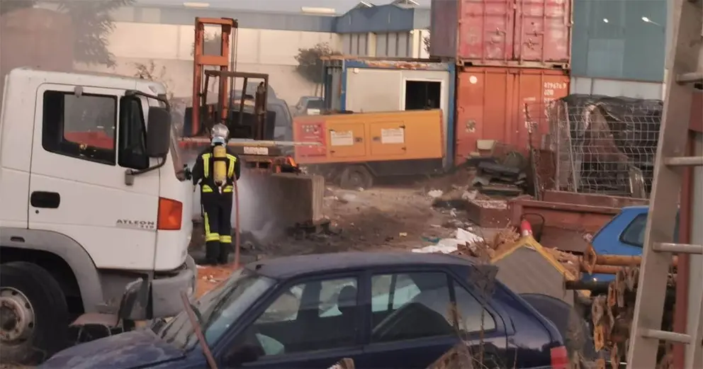 Llamas en el interior de las instalaciones de Grúas Oliva en Jerez