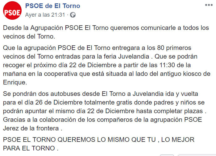 “No sabemos si será por torpeza o por sentirse por encima del bien y el mal, manifiestan, pero el caso es que en El Torno por ejemplo, incluso han publicado con total impunidad el asunto en la página oficial de Facebook del PSOE local, donde anuncian que entregarán las entradas a los primero 80 vecinos que se presenten en las instalaciones de una cooperativa local, y donde muestran su agradecimiento a los socialistas de Jerez por su colaboración”.