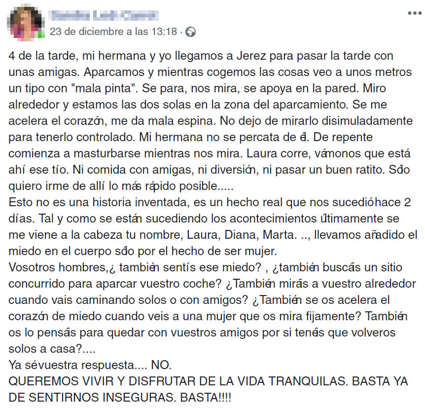En su publicación, la cual se viralizó en pocas horas, indica que "no es una historia inventada, es un hecho real que nos sucedió hace 2 días. Tal y como se están sucediendo los acontecimientos últimamente se me viene a la cabeza tu nombre, Laura, Diana, Marta..., llevamos añadido el miedo en el cuerpo sólo por el hecho de ser mujer".