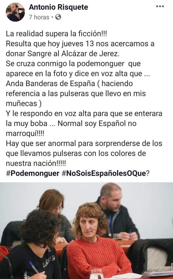 Risquette asegura en un post publicado en la red social de Facebook que durante la mañana del jueves, mientras había acudido a donar sangre al puesto con tal fin ubicado en el Alcázar de Jerez, se cruzó junto a él Kika González, quien le espetó: "Anda Banderas de España". El miembro de Vox destaca que dicho comentario iba dirigido a que llevaba pulseras con los colores de la bandera de la nación española.