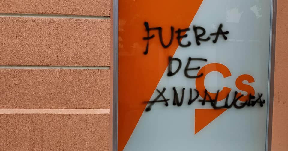 La sede provincial de Ciudadanos en Cádiz, situada en Jerez de la Frontera, ha vuelto a amanecer este viernes con pintadas en su fachada. Un nuevo acto vandálico que ha sido denunciado por el portavoz de Cs en Andalucía, Sergio Romero.