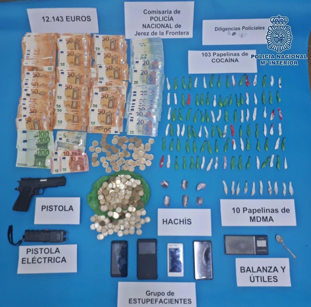 Con los indicios y pruebas recabados se llevó a cabo la entrada y registro en el inmueble autorizada por el Juzgado de Instrucción Nº2 de Jerez, en el interior se localizó a la mujer de cincuenta y cinco años de edad, que fue detenida igualmente por un delito contra la salud pública, y se hallaron las sustancias estupefacientes, los útiles y las armas intervenidas.