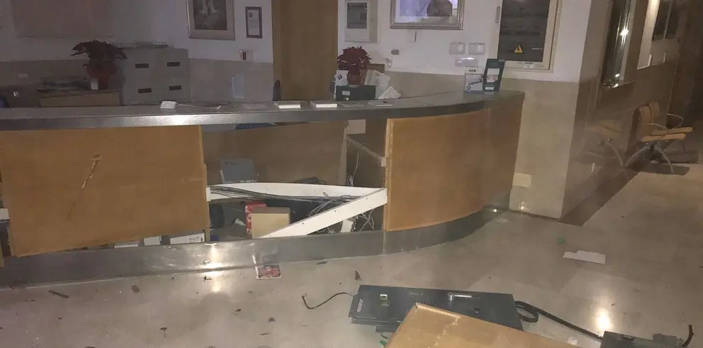 Supuestamente los cacos han desvalijado el cajero automático que se encuentra en el interior del Hospital, aprovechando para destrozar parte del mobiliario, como monitores, percheros, parte del mueble de recepción, etc.