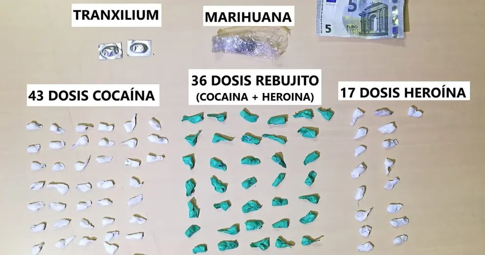 En la bolsa que llevaba y en el cacheo realizado se encontraron en su poder 43 papelinas de cocaína, 36 envoltorios de “rebujito”, mezcla de heroína y cocaína, 17 bolsitas de heroína, medicamentos ansiolíticos y un recipiente con marihuana, así como una gran cantidad de dinero en metálico fraccionado para facilitar las ventas.