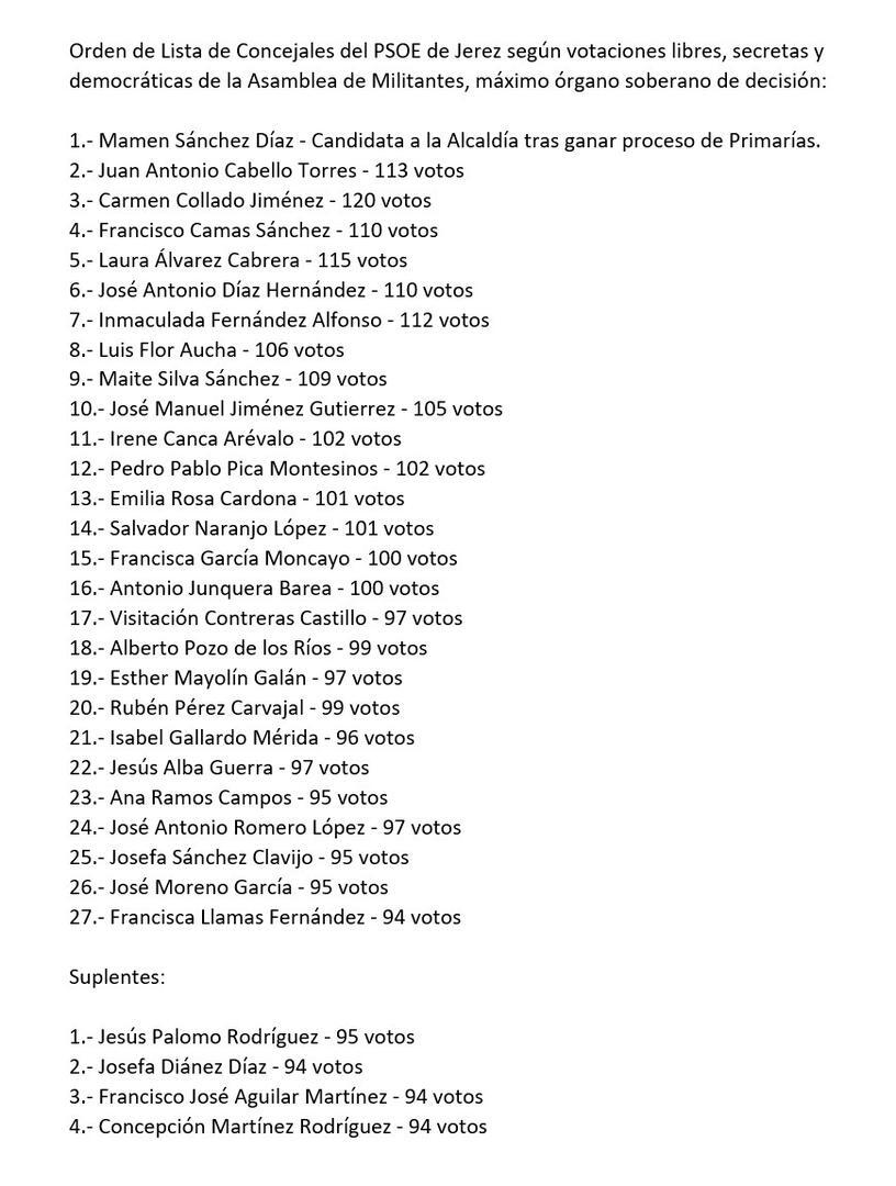 Mamen Sánchez ha optado por tanto por no hacer caso al resultado de las urnas y situar en puestos de salida a candidatos que no estuvieron entre los más votados por la militancia. Según la propia alcaldesa se trata de: "Una lista de hombres y mujeres preparadas para seguir gobernando Jerez y para continuar profundizando en los avances conseguidos durante este mandato".