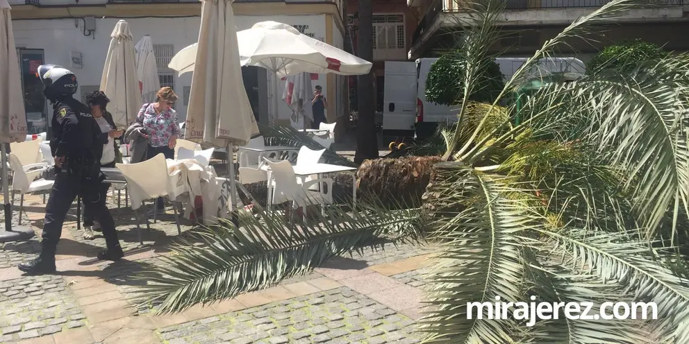 Una palmera ha caído durante la mañana del miércoles en la plaza del Progreso, en el centro de Jerez, justo al lado de un parque infantil, frente al bar Camachuelo.