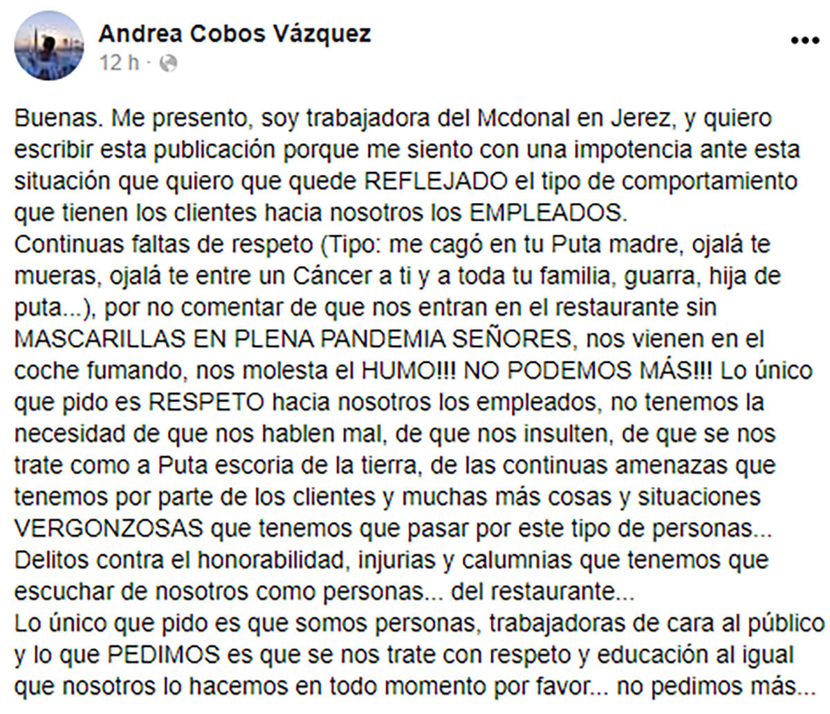 Los continuos insultos y amenazas de algunos clientes han hecho estallar a Andrea C.V., una trabajadora de McDonald's en Jerez de la Frontera. La joven ha realizado una publicación en Facebook para relatar la situación que viven en su restaurante de comida rápida.