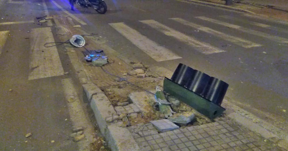 Un turismo ha colisionado brutalmente contra un semáforo en la isleta de la intersección, llevándose arrastrando la base del mismo en los bajos del coche hasta unos 80 metros de distancia.