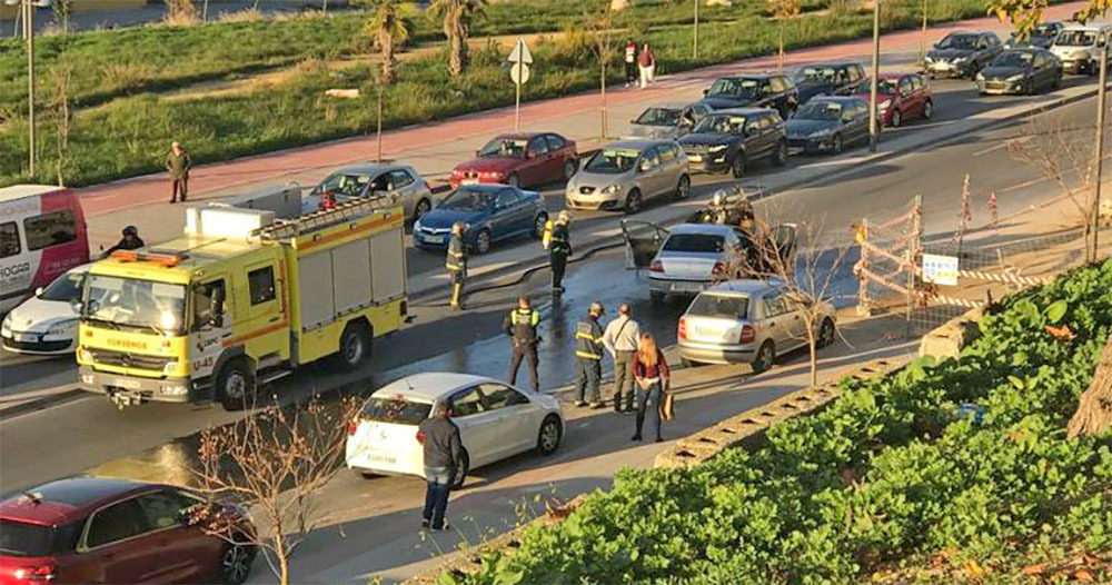 Hasta el lugar han acudido unidades de la Policía Local y Dotaciones de Bomberos, quienes han sofocado las llamas, mientras los agentes realizaban labores de control y ordenamiento del tráfico rodado.