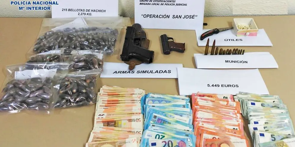 - En el registro efectuado se intervinieron 2.300 gramos de hachís, 5.449 euros en metálico, dos pistolas de fogueo, un arma blanca y doce cartuchos de proyectiles de arma de fuego de distinto calibre