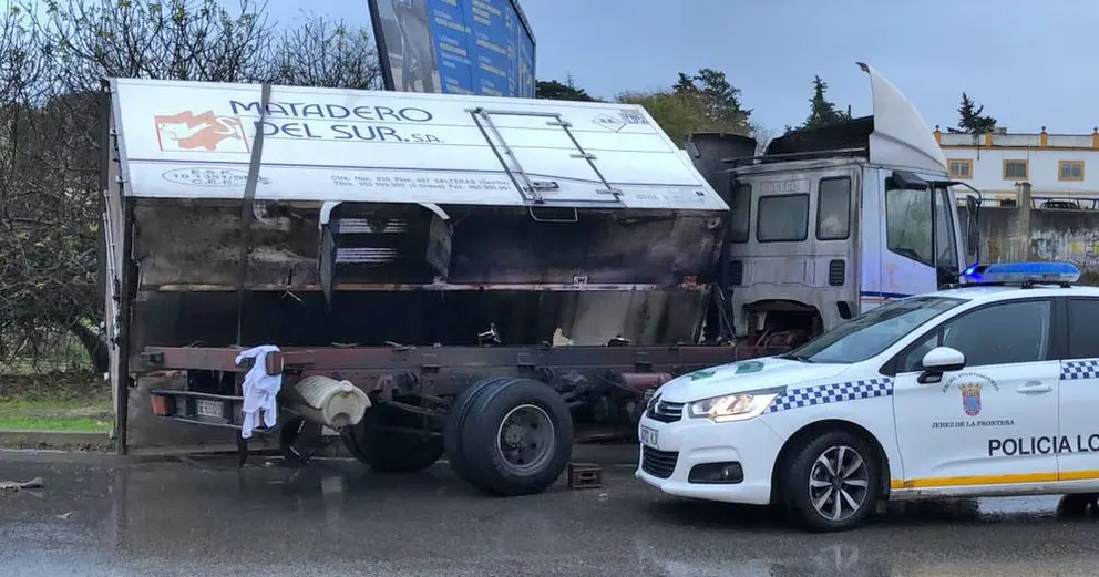 Vuelca en Jerez un camión de productos cárnicos