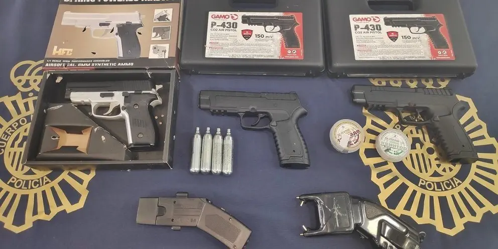 Junto a agentes de la Unidad de Prevención y Reacción, los investigadores practicaron la entrada y registro en la vivienda de los tres jóvenes detenidos por su presunta implicación en los delitos de amenazas y tenencia de armas prohibidas. En el inmueble se localizaron dos pistolas eléctricas -tipo táser-, otras tantas de aire comprimido y una simulada.