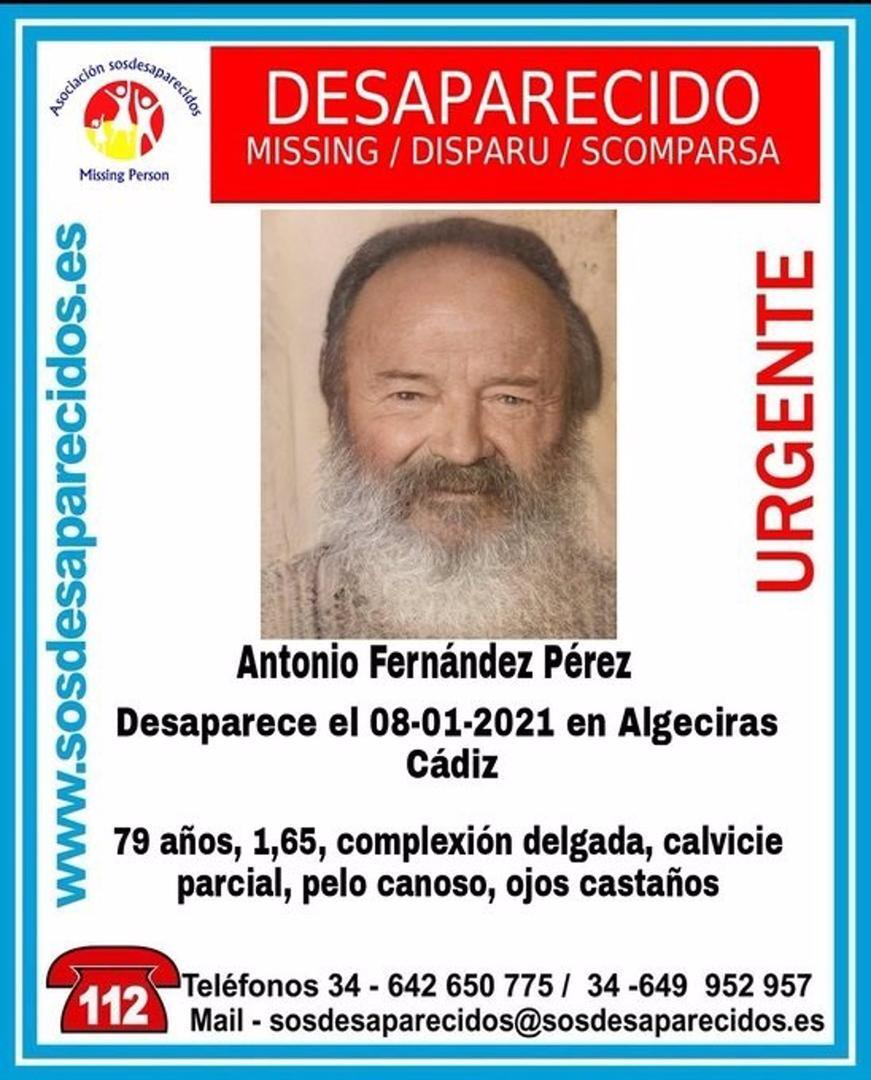 Las autoridades han lanzado una alerta sobre la desaparición de un anciano de 79 años al que se le vio por última vez hace una semana. Responde al nombre de Antonio Fernández Pérez y se le perdió la pista en Algeciras (Cádiz).