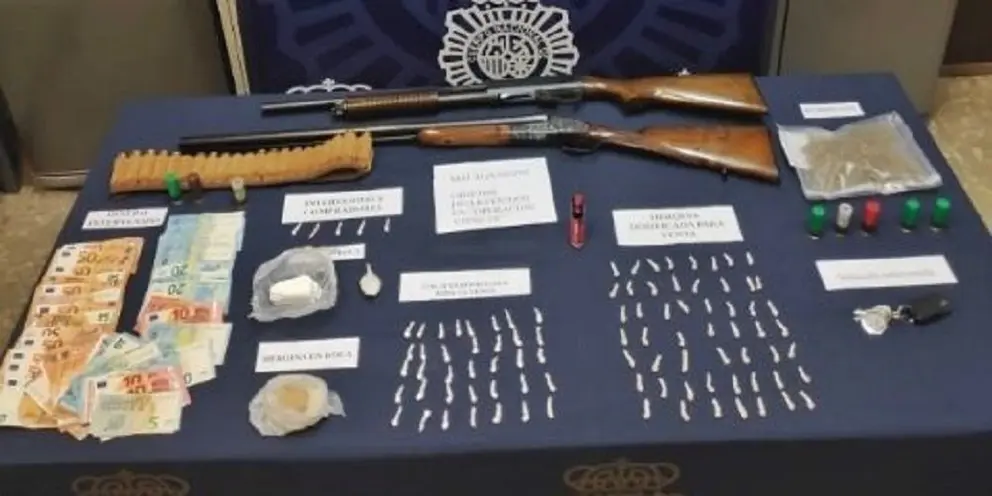 En los registros practicados se han incautado de 53 papelinas de heroína, 41 papelinas de heroína base, 67 gramos de cocaína, 38 gramos de heroína en roca, 59 gramos de marihuana, 1.720 euros, dos escopetas con munición, un vehículo y diverso material para la preparación del estupefaciente, según ha explicado la Policía Nacional en una nota de prensa.