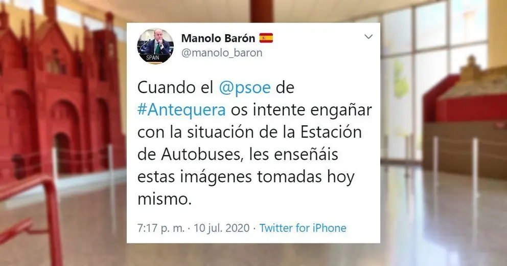 Ante la reciente denuncia pública llevada a cabo por el PSOE de Antequera sobre lo que llaman "servicio tercermundista en la estación de autobuses", el alcalde popular Manolo Barón, ha publicado un tweet con imágenes actuales de la estación de trenes de la localidad que desmontarían el argumento de los socialistas.