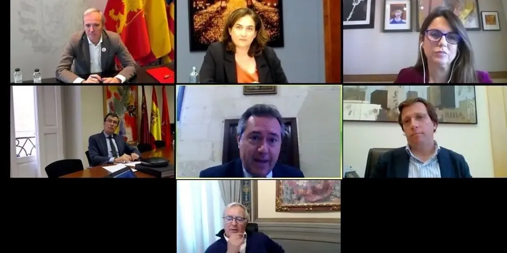 El Ayuntamiento de Málaga ha participado este martes en un encuentro por videoconferencia de los alcaldes y alcaldesas de las siete ciudades más pobladas de España -Madrid, Barcelona, Valencia, Sevilla, Zaragoza, Málaga y Murcia- en el que se han abordado los principales desafíos a los que se enfrentan los municipios con motivo de la crisis sanitaria del coronavirus.