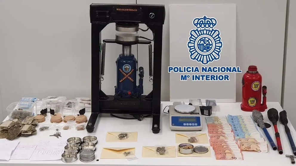 En esta ocasión los agentes se incautaron de 20,5 gramos de marihuana, 10,35 gramos de hachís y 218 gramos de cáñamo prensado. También intervinieron dos prensas hidráulicas, tres moldes de prensar, una báscula de precisión, documentación y dinero en efectivo.