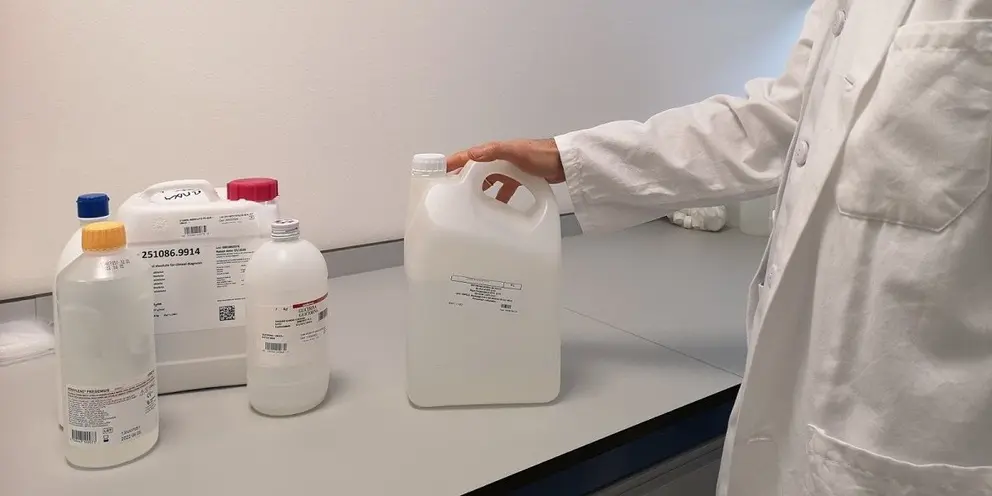 La fabricación se ha realizado en garrafas de cinco litros, que tras pasar el periodo indicado previo a su utilización en dichos recipientes, se reenvasan en envases de un litro que se han distribuido por las distintas unidades asistenciales del centro sanitario para reforzar este tipo de producto tan utilizado en estos momentos.