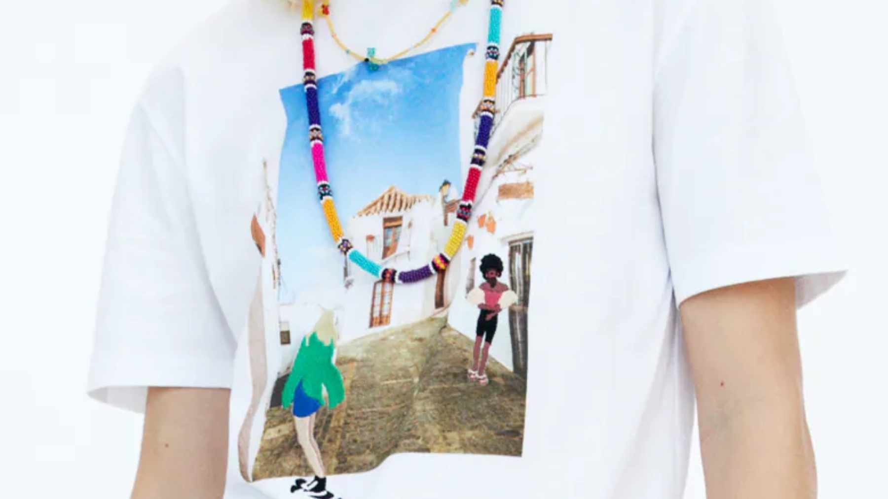 Así es, Zara ha puesto a la venta como parte de la colección de final de verano 21 una camiseta de manga corta con una foto bastante peculiar de Vejer de la Frontera, en Cádiz: Un collage propio de una skeater y otra transeúnte con la calle Trafalgar con su característica casa blanca con tejas y el Bar Trafalgar como escenario.