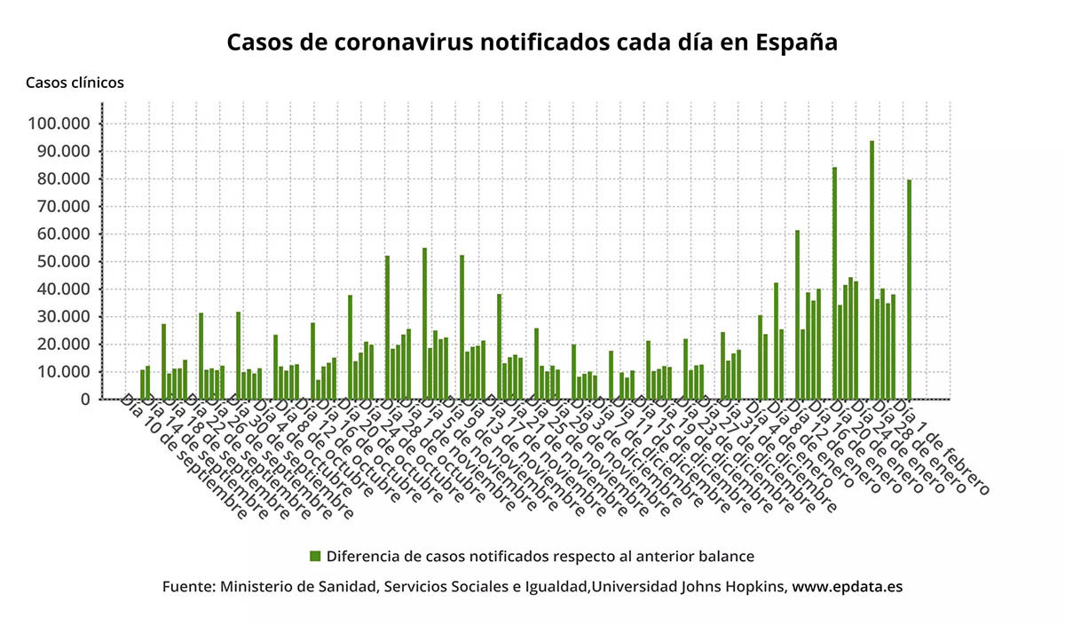 Cifras terribles. Las comunidades autónomas han notificado este lunes al Ministerio de Sanidad 79.686 nuevos casos de COVID-19 durante el fin de semana. 5.026 de los casos nuevos han sido diagnosticados en las últimas 24 horas. Estas cifras son inferiores a las del mismo día de la semana pasada, cuando se notificaron 93.822 positivos.