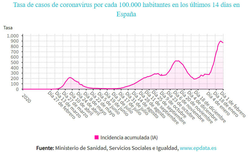 La cifra total de contagios en España se eleva ya a 2.822.805 desde el inicio de la pandemia, según las estadísticas oficiales. La incidencia acumulada en los últimos 14 días por 100.000 habitantes se sitúa en 865, frente a 886 el viernes. En las pasadas dos semanas se ha registrado un total de 407.091 positivos.
