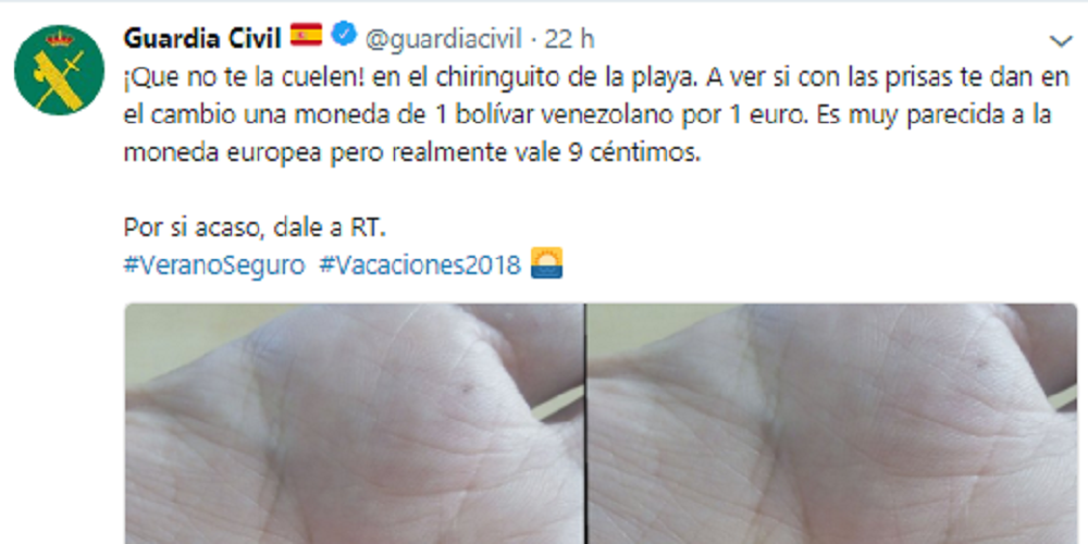 En citado tweet se recoge lo siguiente: "Que no te la cuelen! en el chiringuito de la playa. A ver si con las prisas te dan en el cambio una moneda de 1 bolívar venezolano por 1 euro. Es muy parecida a la moneda europea pero realmente vale 9 céntimos.".