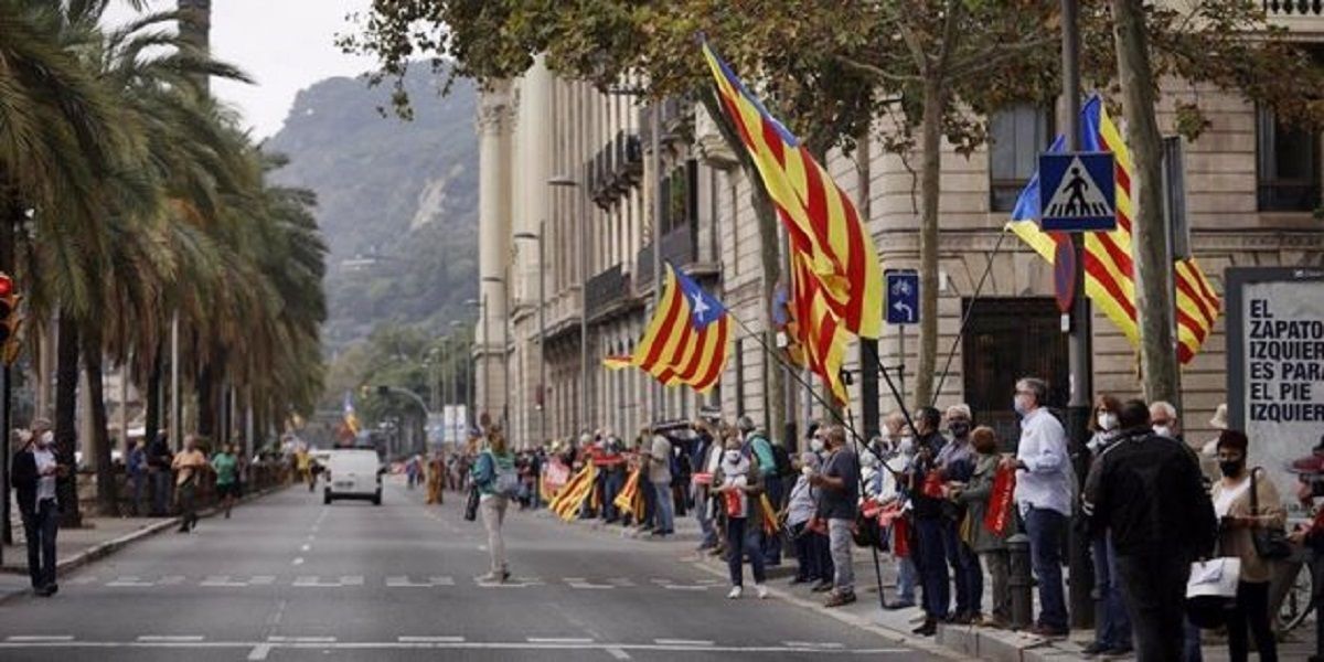 La cadena humana (en el que las personas guardan la distancia de seguridad y no se dan las manos) va desde Pla de Palau --donde está el cordón policial que impide acercarse a estación de França-- al Monumento de Colón, para "dejar claro que Felipe VI no es bienvenido y que Catalunya no tiene rey".