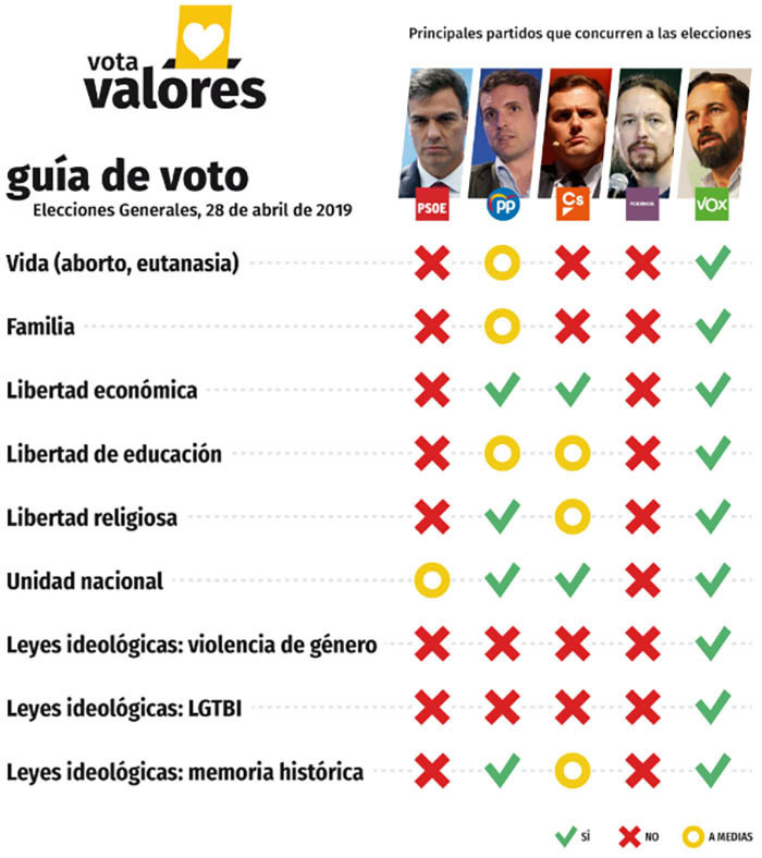 El portal de dicha plataforma es en realidad una Guía del Voto, en la que además solicitan a los lectores de su web que muestren su apoyo a políticas en defensa de la vida, la familia y las libertades: "Tenemos hasta el 28 de abril, día de las elecciones generales, para convencer a las fuerzas políticas de centro-derecha de que de nada sirve vencer a la izquierda si luego siguen aplicando sus mismas políticas y no derogan las leyes ideológicas que las amparan. Tenemos una oportunidad única de influir en los partidos que mejor pueden representar nuestros valores… pero para que lo hagan, tienes que hacerles saber tu compromiso de premiar en la urnas al candidato y al partido que más apueste por defender la vida, la familia y las libertades públicas. Firmando el Manifiesto del Votante, te estarás comprometiendo a votar al partido que más apueste por los valores que defiendes. Hazles llegar tu compromiso a Pablo Casado, Albert Rivera y Santiago Abascal".