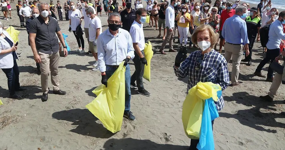 La reina Sofía ha participado como voluntaria en la campaña '1m2 por las playas y los mares' con la recogida de residuos que ha tenido lugar este sábado en la Cala del Moral (Málaga), donde ha conocido además el trabajo de voluntarios y buceadores en la limpieza de los fondos marinos.
