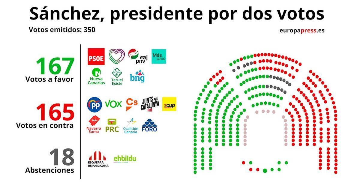 El socialista Pedro Sánchez ha logrado este martes ser investido presidente del Gobierno al superar la votación definitiva en el Pleno del Congreso por sólo dos votos de diferencia, 167 a favor frente a 165 en contra, el margen más estrecho de la España constitucional.