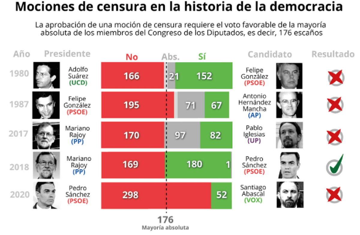 La última moción, la que permitió a Sánchez acceder a La Moncloa en junio de 2018, fue la única que prosperó al reunir 180 votos a favor (PSOE, Unidas Podemos, ERC, PDeCAT, PNV, Compromís, Bildu y Nueva Canarias) frente a 169 en contra (PP, Ciudadanos, UPN y Foro Asturias) y una abstención, la de Coalición Canaria.