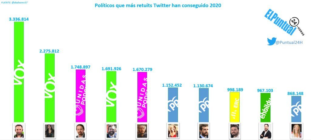 Indiscutiblemente, el político con más interacciones ha sido Santiago Abascal con 3.336.814 interacciones. El líder de Vox aventaja al segundo clasificado, también de su propio partido, en más de un millón de interacciones. "No lo pregonemos demasiado que enseguida me quitan la cuenta o ponen una advertencia permanente por cada uno de mis mensajes. Los progres que dirigen Twitter ya se han atrevido incluso con el presidente de EEUU", escribía Abascal.