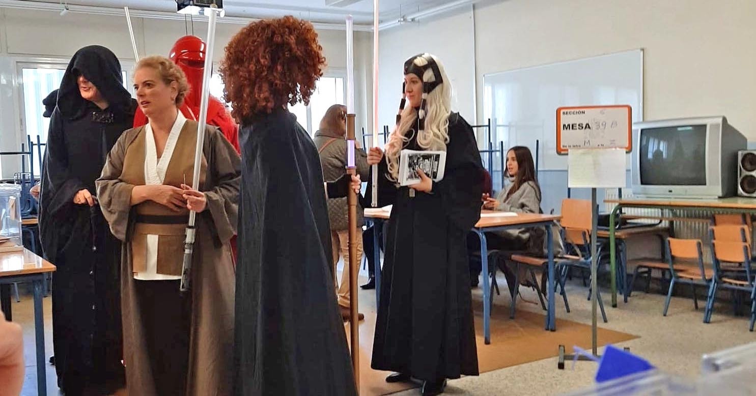 La anécdota de la jornada se ha producido también en Sevilla, en el colegio 'Juan Ramón Jiménez' del barrio de Triana, donde alrededor de las 11,00 horas cinco personas han entrado disfrazadas de distintos personajes y figurantes de la mítica saga de Star Wars, tres de ellas de jedi, otra de Guardia Real del Emperador y otra de Darth Vader.