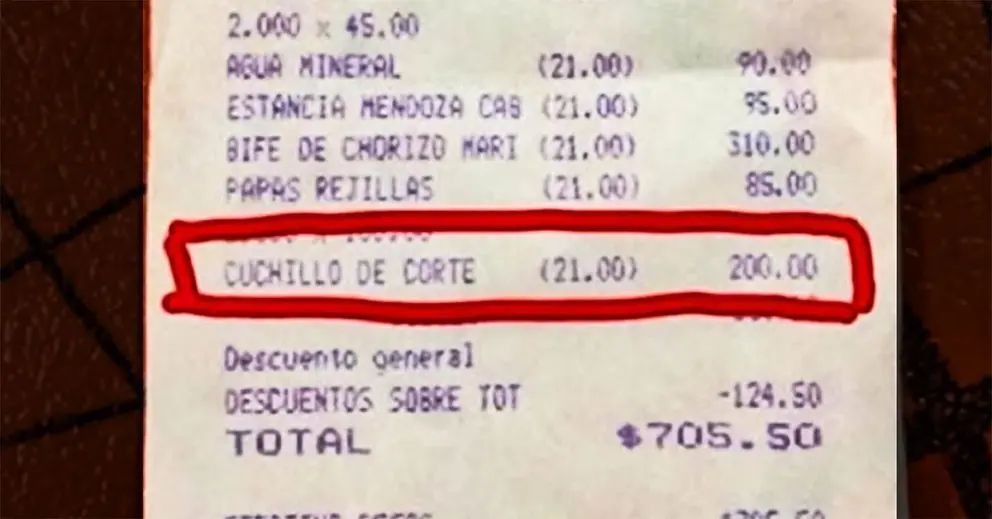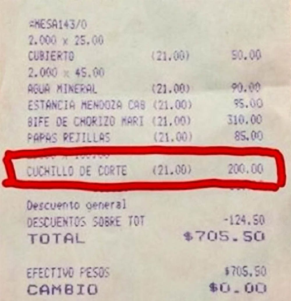 Durante este verano se han hecho virales muchos tickets de bares. Algunos hasta cobran un suplemento por el hielo. Pero el remate de todos los remates, lo nunca visto, era que cobraran por el uso de un cuchillo para cortar la carne.