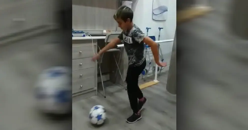 El pequeño realiza sus primeros ejercicios de habilidad con la prótesis de la pierna izquierda