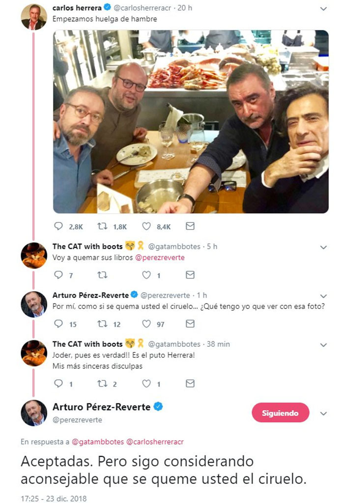 Un selfie de Carlos Herrera en su cuenta Twitter ha acabado en un tremendo "zasca" del escritor Arturo Pérez-Reverte a un twittero quien lo había confundido con el periodista. El periodista de COPE publicó la foto junto a la frase "empezamos huelga de hambre" mientras estaba siendo acompañado en un restaurante de Madrid por Salvador Sostres, Arcadi Espada y Juan Carlos Girauta, de Ciudadanos.