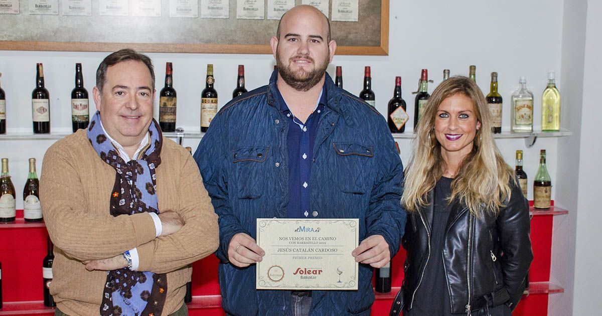 Manuel Reina, en nombre de María Jesús Medina, junto a Antonio Díaz de Bodegas Barbadillo y Beatriz Brazales, directora de ByB Comunicación, recoge el Segundo Premio en el Concurso "Nos Vemos en el Camino" con Barbadillo | Noelia Herrero para elMIRA.es