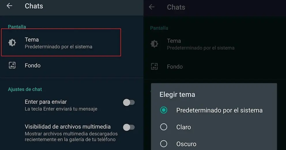 Se trata de 'Temas', y puede encontrarse dentro de la configuración de los 'Chats', justo encima de 'Fondo'. Al pinchar sobre los temas, aparecen tres opciones entre las que elegir: 'Predeterminado por el sistema', 'Claro', 'Oscuro'.