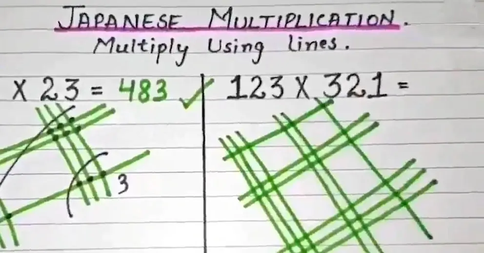 En Japón enseñan a los niños a multiplicar de una forma más intuitiva y distinta a Occidente. El método es la multiplicación visual con líneas. Consiste en dibujar una serie de rectas separadas entre sí que coinciden con los dígitos de los números a multiplicar.