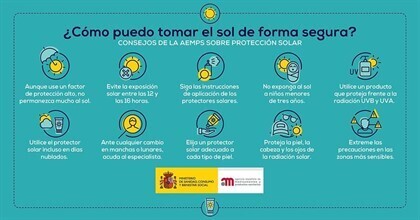La Agencia Española de Medicamentos y Productos Sanitarios (AEMPS), dependiente del Ministerio de Sanidad, Consumo y Bienestar Social, ha publicado un decálogo de recomendaciones generales que busca promover cómo tomar el solar de forma segura y fomentar el buen uso de las cremas protectoras, entre los que se encuentran no permanecer mucho tiempo al sol a pesar de usar un factor de protección alto o no exponer a los niños menores de tres años.