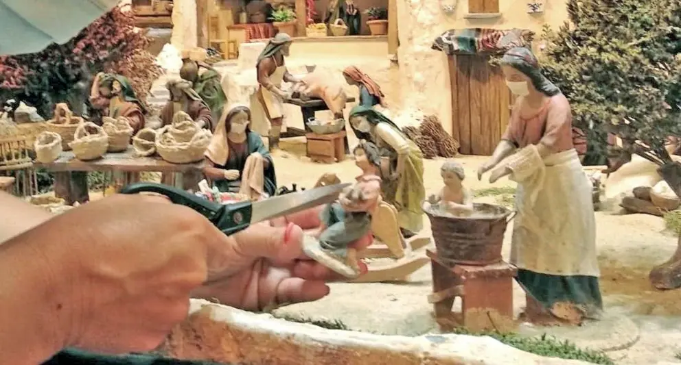 Las costureras están tejiendo mascarillas para proteger al resto de personajes del virus. Y todas las figuras del Belén guardarán "escrupulosamente la distancia social de seguridad para evitar los contagios".
